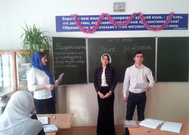 Дениева К.Н. предложила десятиклассникам высказать свое мнение по вопросам «Согласны ли вы с тем, что общество действительно должно столь активно заниматься решением проблем тяжелых инвалидов? Готовы ли вы стать помощниками слепоглухому человеку?» Интересные, правильные и продуманные ответы были у Батаева А., Умалатовой Т., Муртазова Д.Бакаров Имран сказал: «Добро должно быть во всем мире всегда! И не важно, инвалид ты или не инвалид. Главное помнить, что если ты поможешь другому, то тогда добро придет и к тебе!»