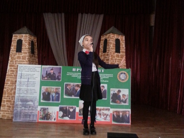 Заместитель директора по В/Р Гайтаева Х.Ю. рассказала о месте Кадыровых в жизни Чеченской Республики, России. При этом она отметила: «Любовь к Родине, ее процветание, слава ставились во все времена превыше всего. Это и есть патриотизм. Послевоенные развалины в Чечне на глазах превратились в современные жилые кварталы, повсюду были построены школы, детские сады, больницы, мечети. Вскоре даже самым безнадежным пессимистам стало понятно, что Рамзан Кадыров - это безоговорочный лидер нации, герой не только чеченского народа, а также герой России.»