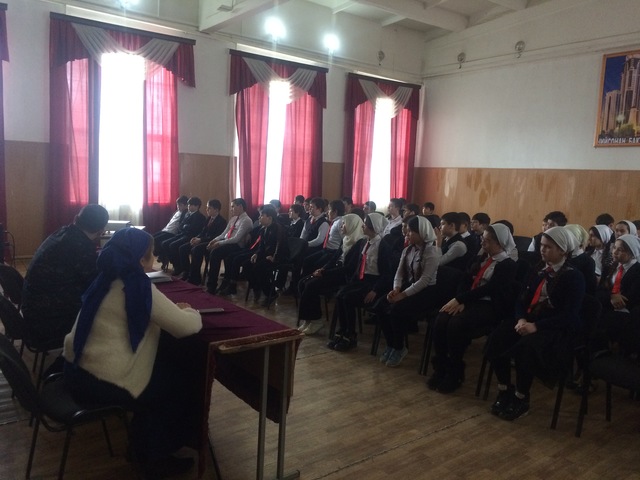 Заместитель директора по ВР Гайтаева отметила в начале мероприятия, что террористы – это люди, которые захватывают в заложники, организуют взрывы в многолюдных местах, используют оружие. Часто жертвами терроризма становятся невинные люди, среди которых есть и дети. Всем нам необходимо объединить свои усилия против этого страшного зла.