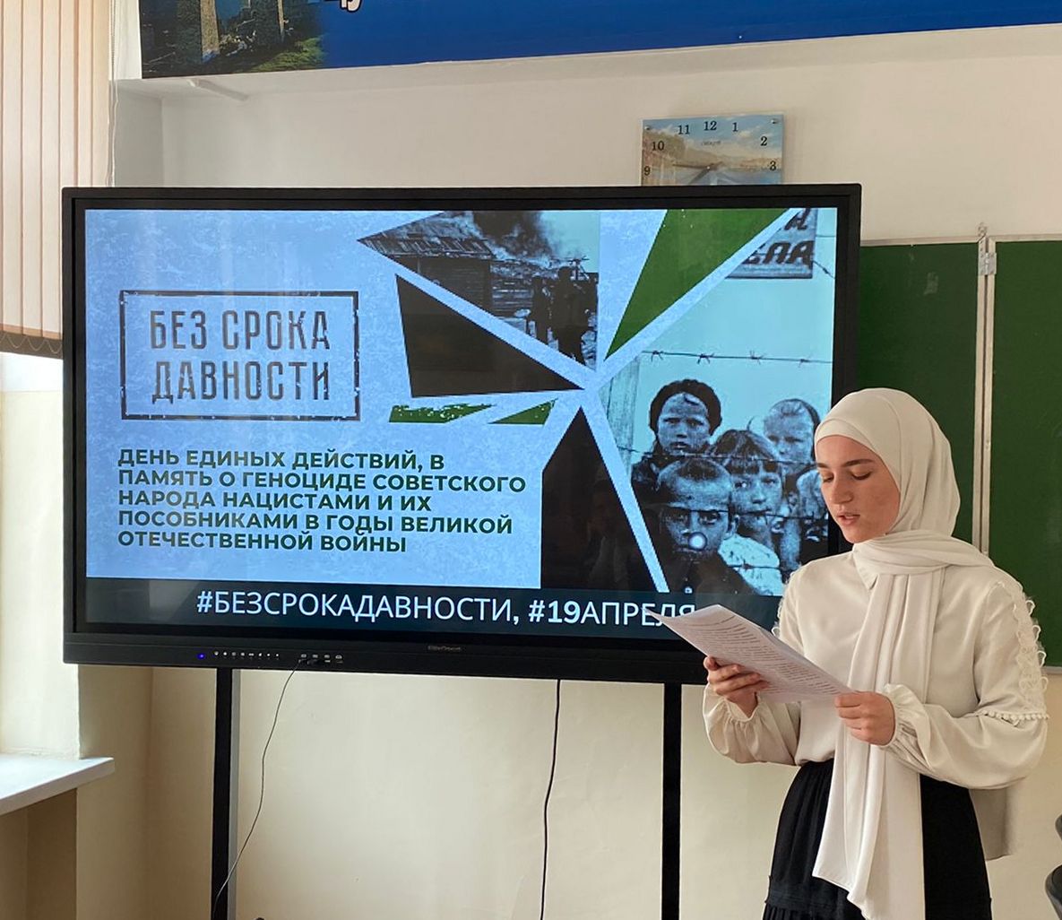 15.04.202215 апреля 2022 года в МБОУ «Гудермесская СШ 1» прошел урок «Без срока давности», в рамках Дня единых действий в память о геноциде советского народа нацистами и их пособниками в годы Великой Отечественной войны. Его участниками стали Учащиеся 8–11- х классов. Урок был проведен в преддверии 19 апреля – особой даты в сохранении исторической правды о преступлениях нацистов.