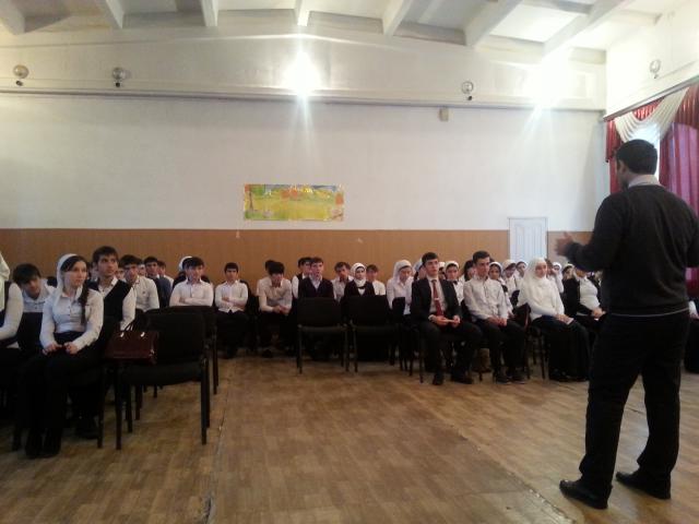 Ученик 11А класса Тутаев Ю. выступил с сообщением «Влияние алкоголя на организм человека», сопровождая свое выступление слайдами. Это, бесспорно, привлекло внимание школьников. Продолжили мероприятие старшеклассники Умаев Д., Абдулкадыров Х., Сайтханов Ш., Джамалдинов Б.. Они в своих докладах раскрыли сущность наркомании, алкоголя и негативное влияние их на организмы подростков.