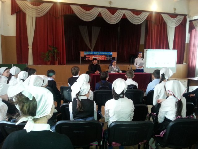 02.04.2015С целью акцентировать внимание школьников на необходимость проявления бдительности, профилактики совершения террористических актов; ознакомить воспитанников с основными правилами поведения в условиях теракта и захвата “в заложники” в МБОУ «СОШ№1 г. Гудермеса» состоялось 02.04.2015г. внеклассное мероприятие«Террор не для нас» для учащихся 5-х классов. Руководитель ОБЖ Каимова М.Р. ознакомила присутствующих с обстановкой в мире по совершению террористических актов. Далее с учащимися была проведена работа по понятию «Терроризм». Большой интерес у детей вызвал рассказ Миланы Руслановны о боевиках « Талибана», когда они использовали восьмилетнюю девочку для совершения терракта на юге Афганистана. Заместитель директора по В/Р Хавра Юсуповна продолжила разговор с пятиклассниками о терроризме - тяжком преступлении, когда организованная группа людей стремиться достичь своей цели при помощи насилия. Дети осудили терроризм, как явление, не совместимое с человеческой моралью.Педагог – организатор ДНВ Доскаев М.Б. подверг критике действия террористов, опираясь на основные принципы Ислама. С каким волнением дети смотрели мультфильм «Зина, Кеша и террористы»! При обсуждении действий террористов школьники проявили высокую активность, каждый пытался высказать свою точку зрения. В конце мероприятия детям была предложена памятка по правилам поведения в случае террористической угрозы.
