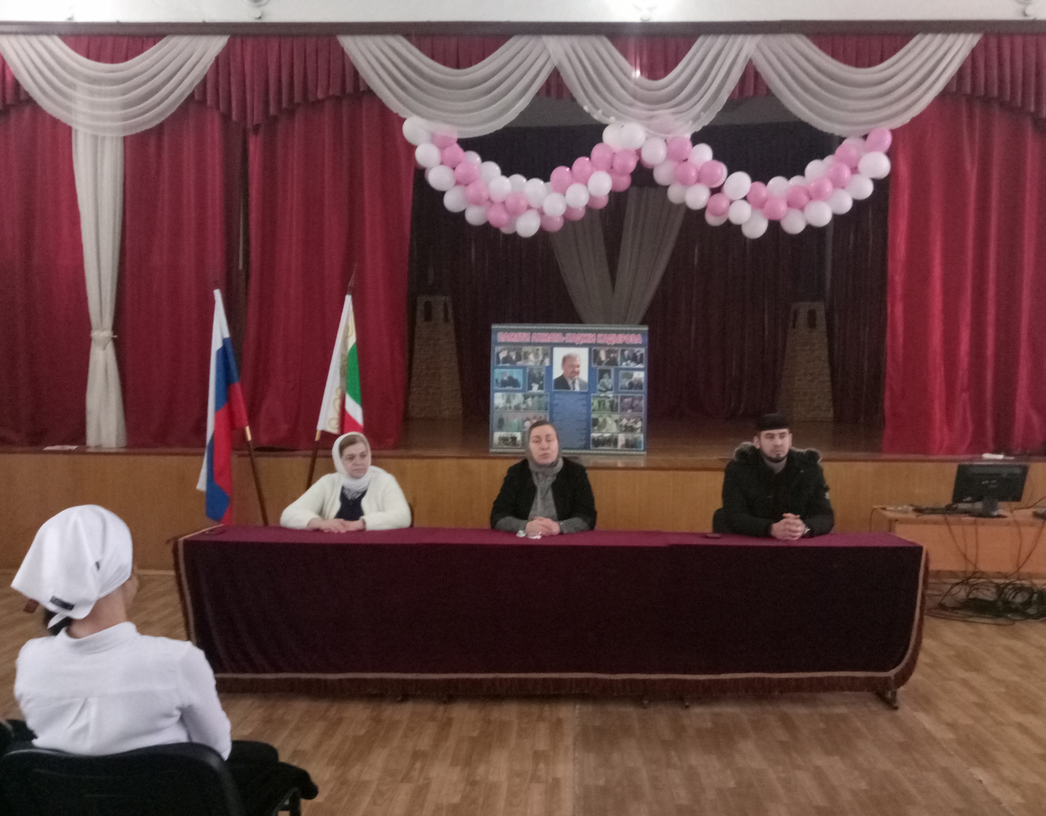 Началось мероприятие с исполнения гимнов Российской Федерации, Чеченской Республики. Директор школы Зарема Умаровна рассказала школьникам о значении Родины для каждого человека, особо подчеркнув при этом, что защита отечества - священный долг каждого гражданина страны. Более подробно она остановилась на заслугах Первого Президента Чеченской Республики А.А.Кадырова, который отдал свою жизнь во имя чеченского народа.
