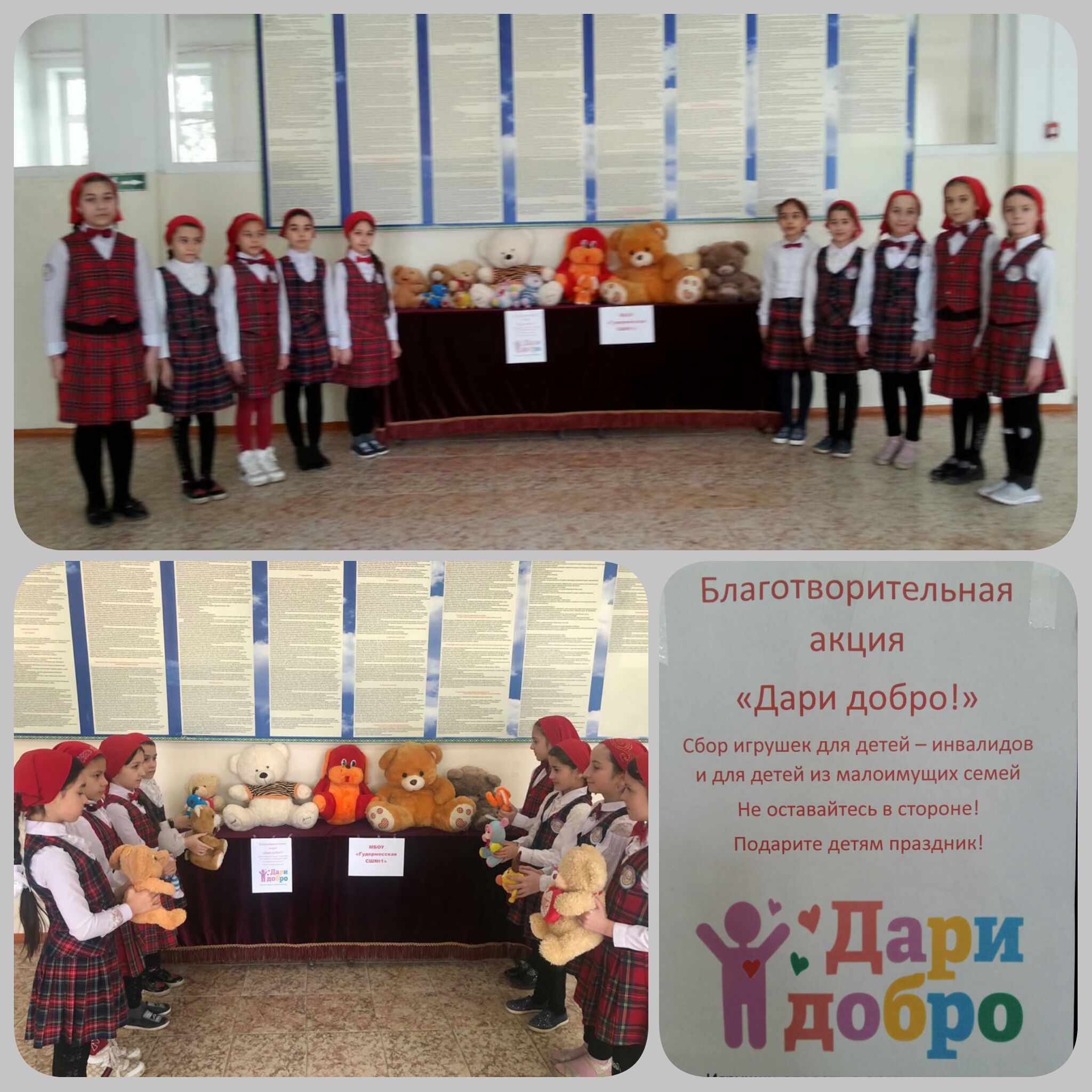 25.01.2019С 25 по 27 января в школе проходит акция "Твори добро!". В рамках благотворительной акции обучающиеся и сотрудники школы принесли творческие наборы, мягкие игрушки, канцелярские товары и сувениры для детей-сирот. При более пристальном взгляде обнаружилось, что акция «Твори добро» более масштабная, чем могло оказаться вначале. Масштабность заключалась не только в большом количестве принявших участие, но и удивила силой, объемностью доброты и милосердия.