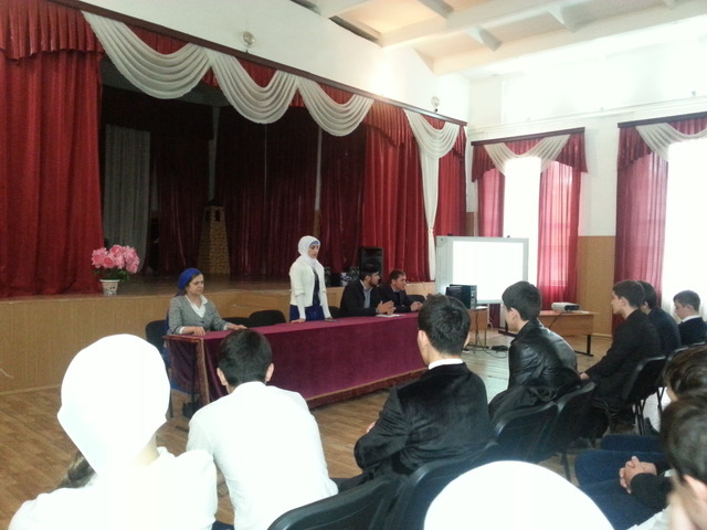 Вначале был продемонстрирован видеофильм «Береги себя», в котором показано разрушительное действие алкоголя, никотина, наркотиков на главные органы человека, на все сферы жизни. Все школьники с большим вниманием смотрели его, осознавая огромный риск, которому подвергается человеческий организм. Учитель обществознания Калаева З.М. обратила внимание учащихся на то, что духовно-нравственное падение человека - это путь к самоуничтожению человека, остановилась на проблемах наркомании, алкоголизма в мире, в России. Ее выступление сопровождалось слайдовым материалом. Учащиеся убеждались в том, что все наркотики, алкогольные напитки являются средствами, влияющими отрицательно на физиологическое, психическое состояние человека. С особым интересом восприняли школьники рассказ имама школы Доскаева М.Б. о несовместимости вредных привычек с моралью мусульманина. Руководитель ОБЖ Гайтукаев А.А. обратился к старшеклассникам всячески противодействовать этому страшному злу - наркомании и алкоголизму. Он подробно остановился на обычаях и традициях чеченцев, которые нетерпимо относятся к этим антиобщественным деяниям.